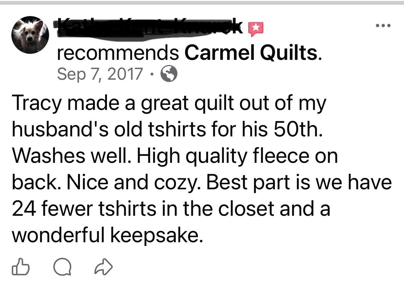 I’d love to make you a t-shirt quilt too! What I need from you is an initial deposit and mail me your shirts).