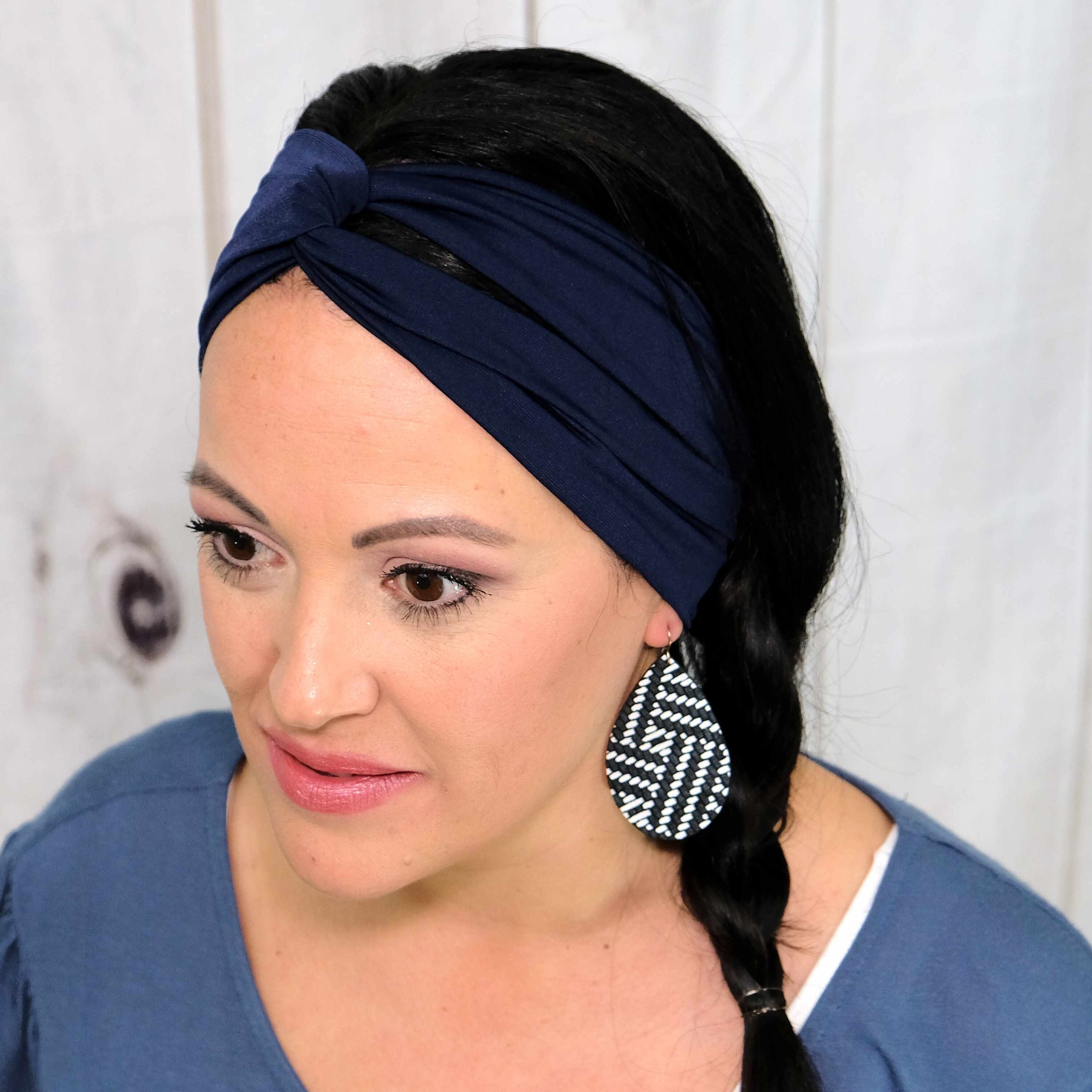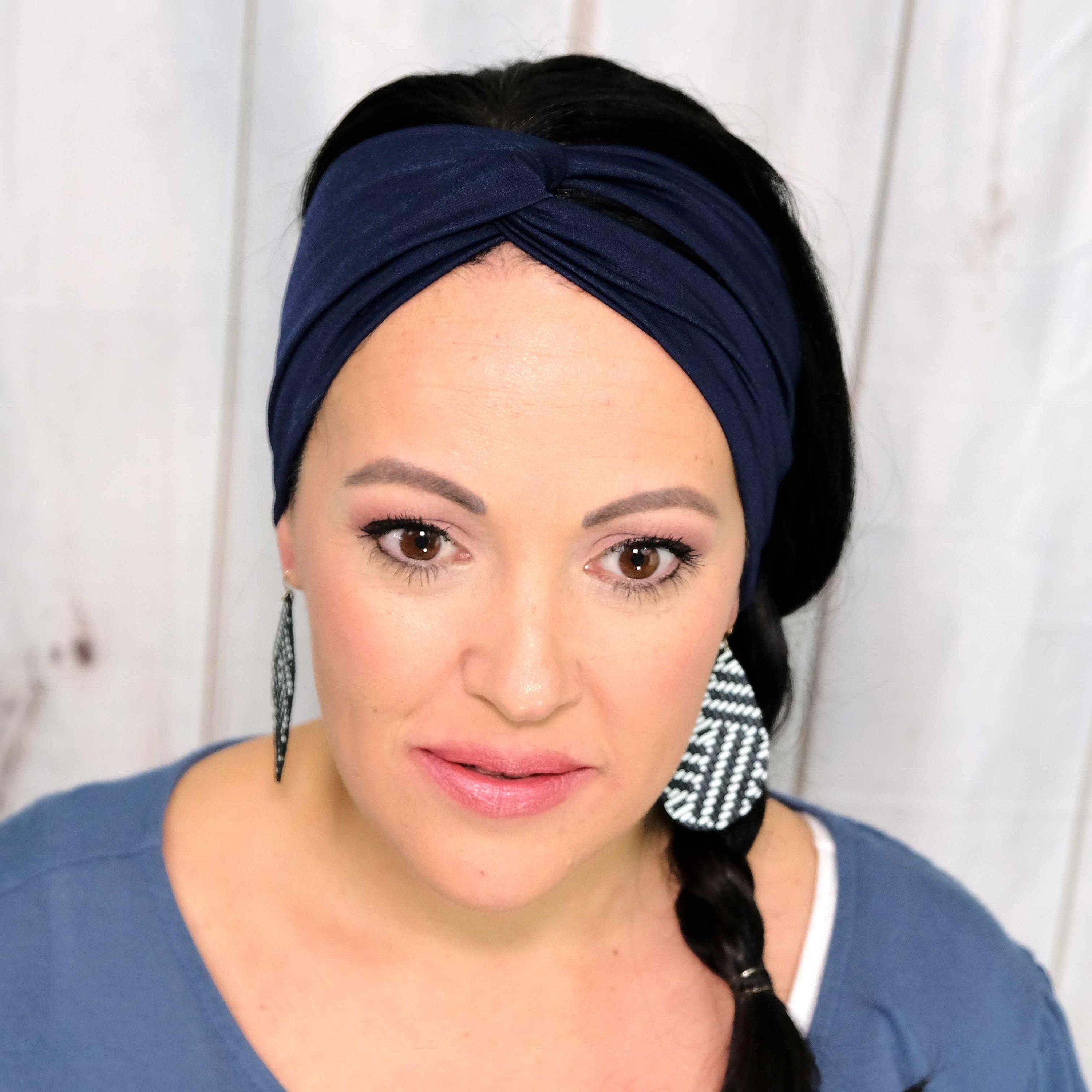 For the best and most secure fit, wear the twisted turban headbands right where your forehead meets your hairline or partially on your forehead as seen in these photos.